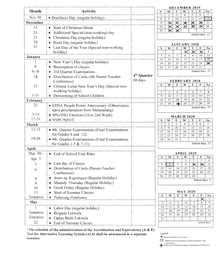 Your school's Bell schedule, minimum or early release days, after-school activities and varying office hours all need tracking. DEPED SCHOOL CALENDAR - The Department of Education (DepEd) releases the school calendar of activities for S. Accomplishment of year-end financial clearance of learners is strictly prohibited in accordance with. #SearchTV #DepEd #School.